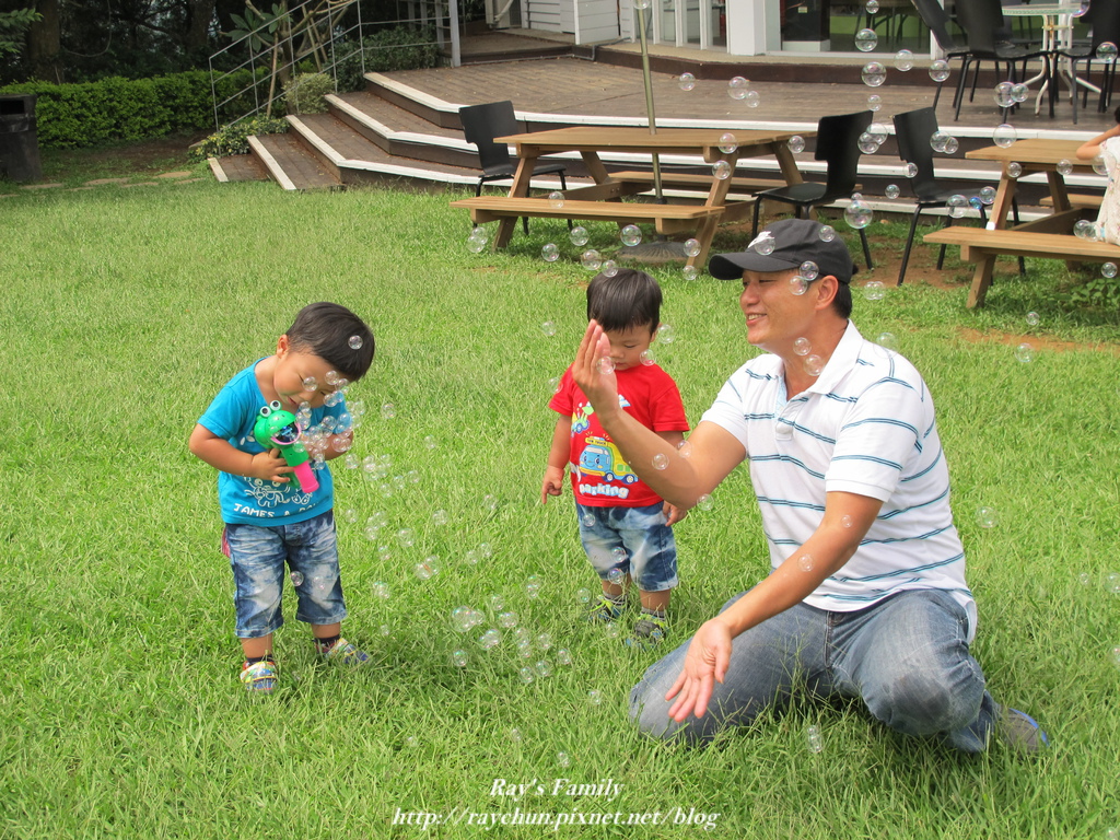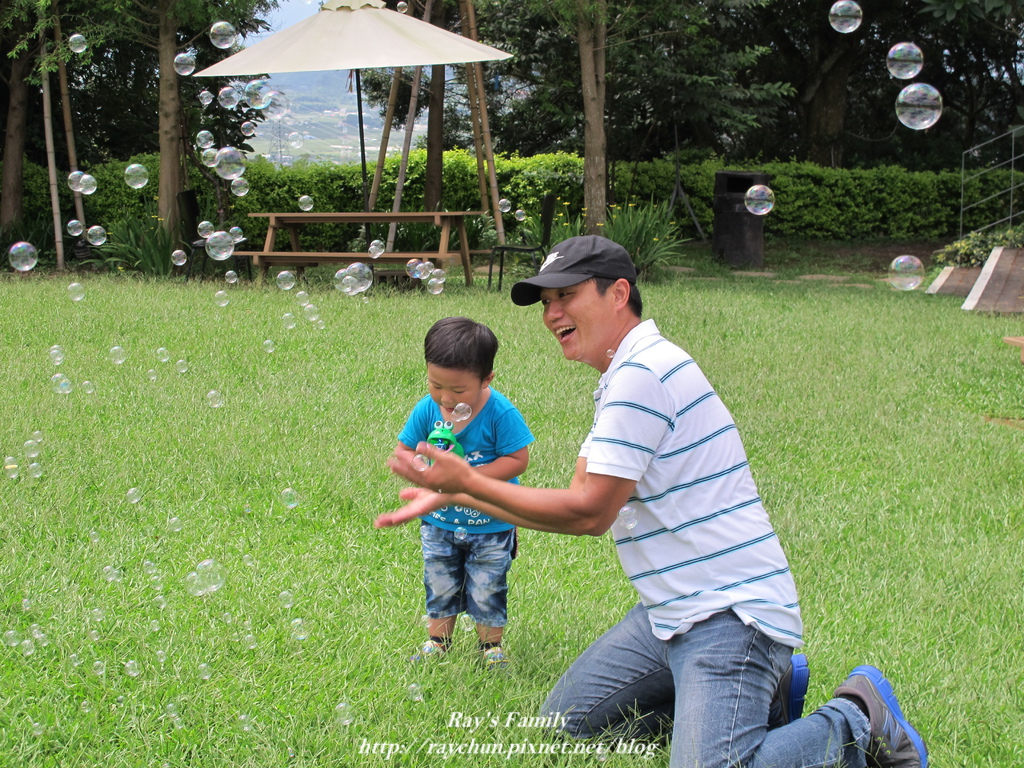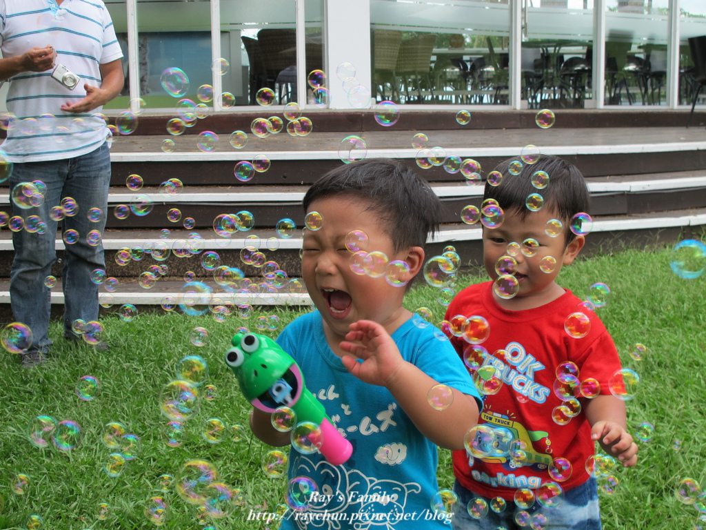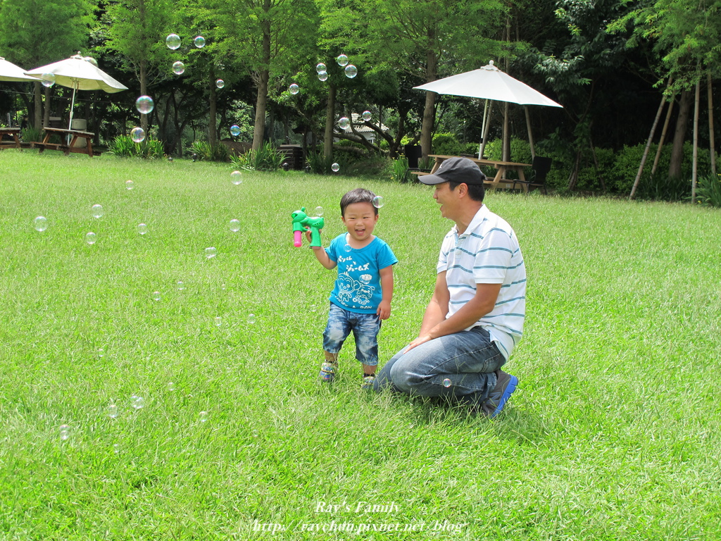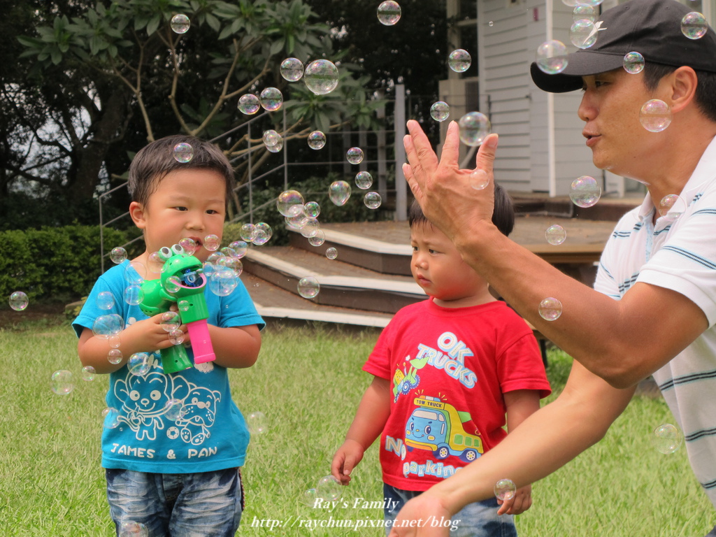 一定要玩的泡泡槍,這回爸爸興起,還用手拍咧!