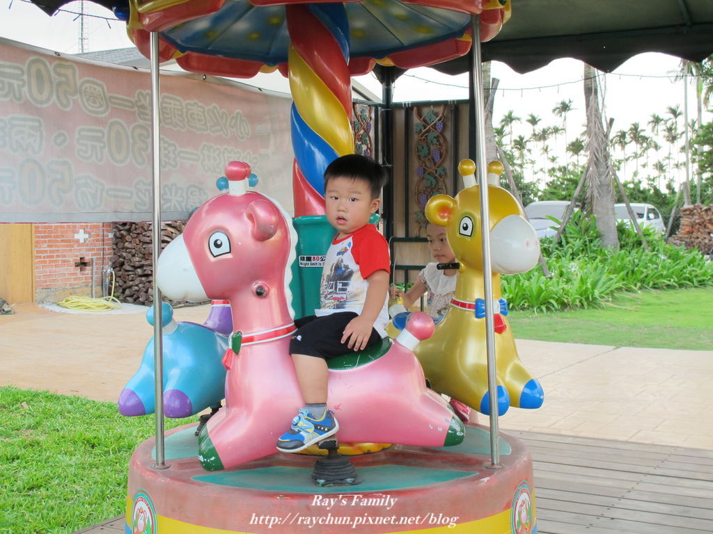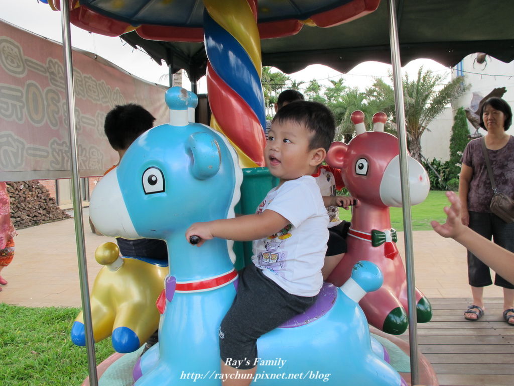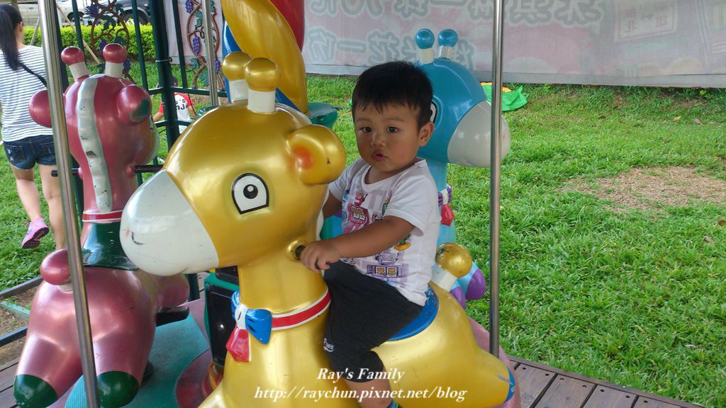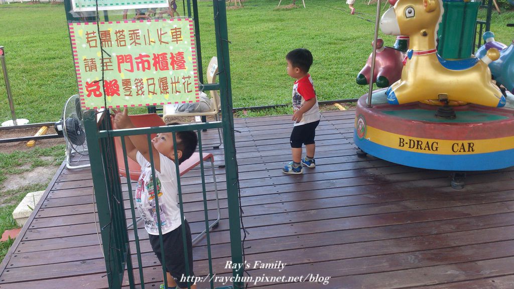走完鐵軌。看到一旁的旋轉木馬也想坐,不行喔!不行喔!還好黃昏時候沒有什麼遊客,坐坐過過乾癮囉!