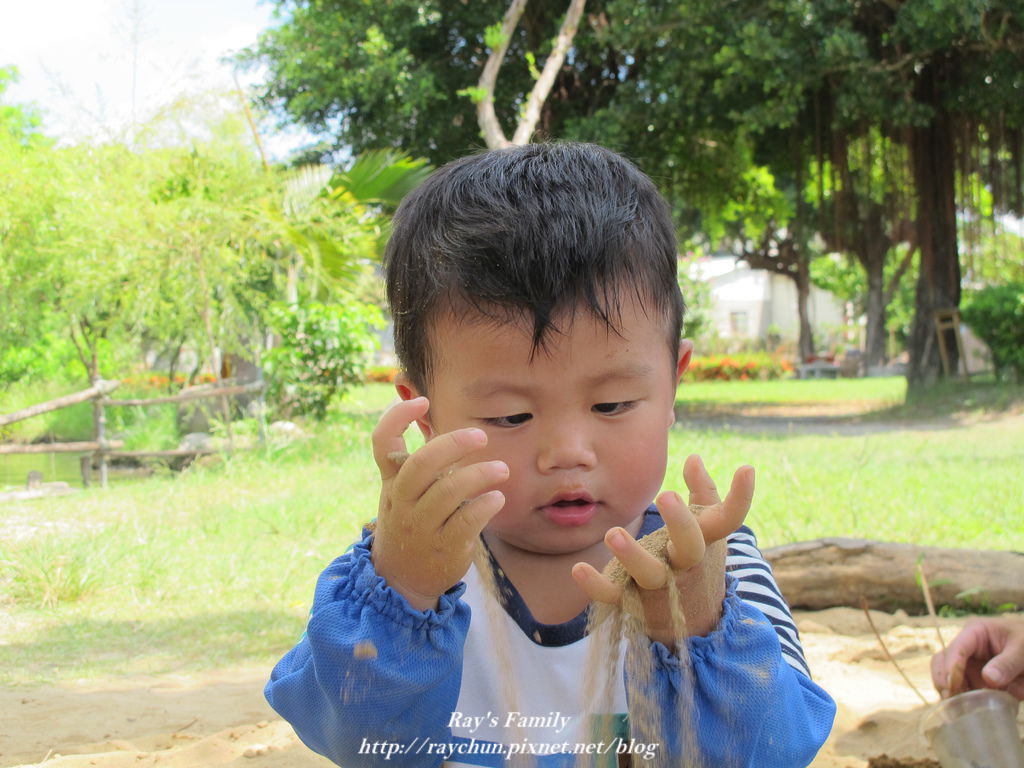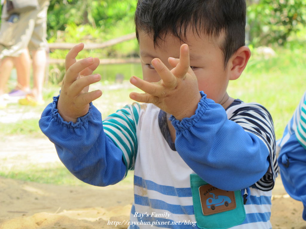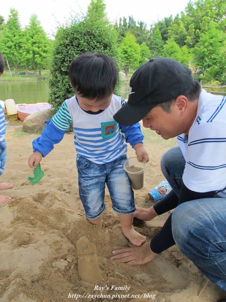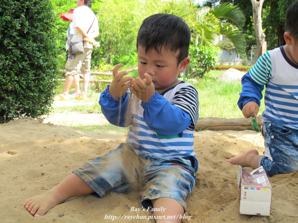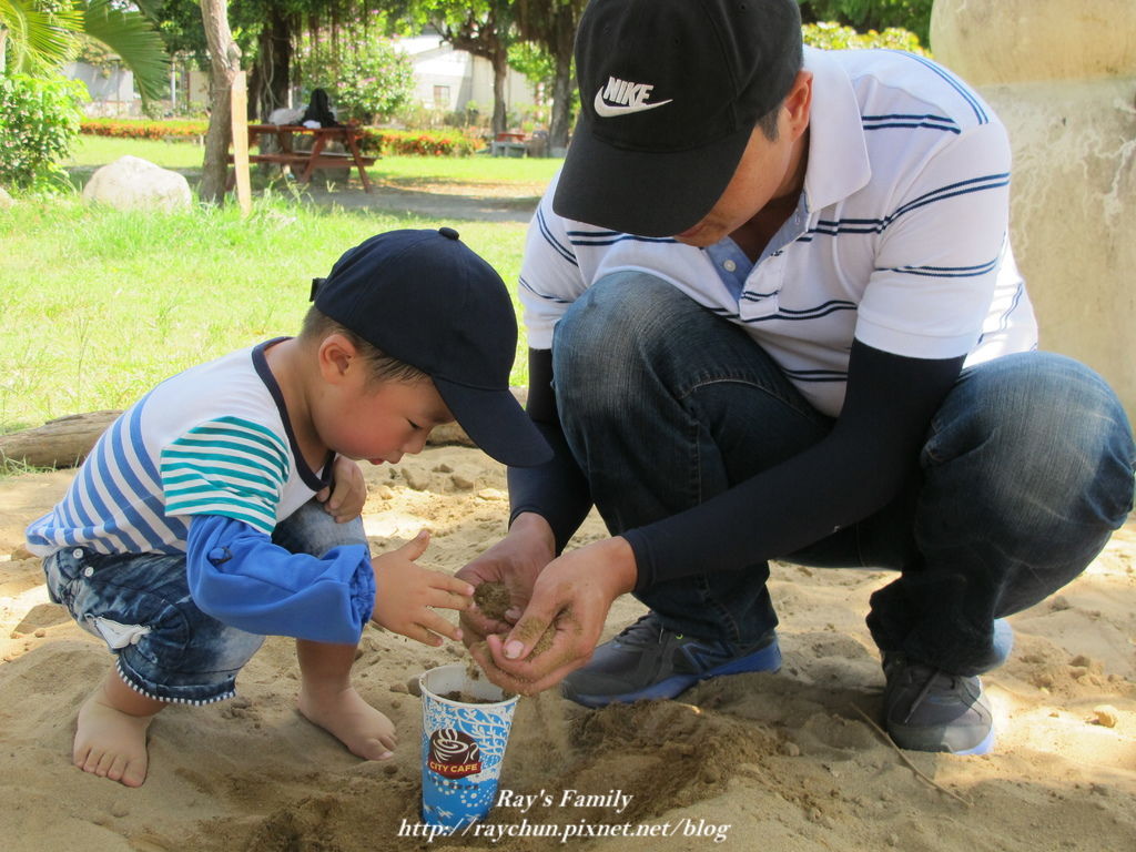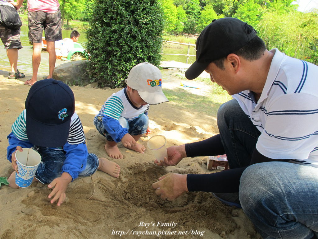 玩沙好了~但沒帶玩具,老公利用飲料空盒來教他們玩